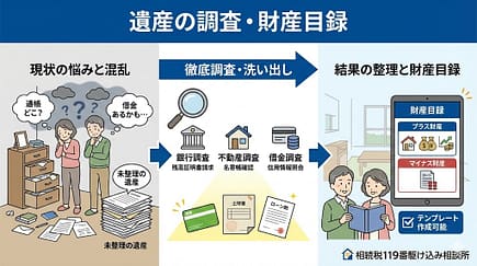 「親の通帳がどこにあるかわからない」「借金があるかもしれない」。遺産分割協議を行う前に、プラスの財産とマイナスの財産を全て洗い出す調査が不可欠です。 銀行への残高証明書請求、名寄帳による不動産確認、信用情報機関への借金照会など、隠れた財産を見つけるための調査方法を網羅しました。調査結果をまとめる「財産目録」のテンプレート作成にも役立ちます。