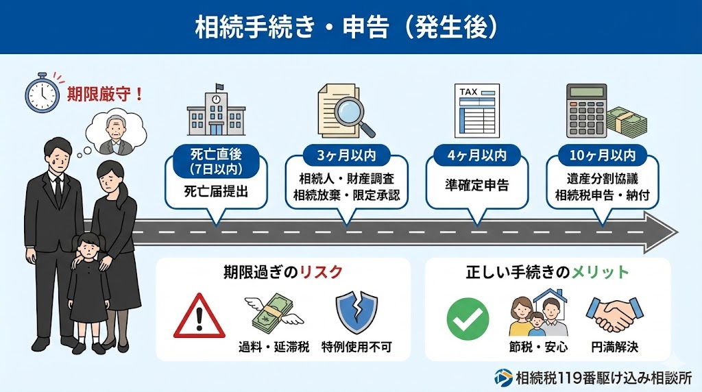 大切な家族が亡くなられた後、悲しむ間もなく多くの手続きが待っています。期限を過ぎると過料が発生したり、節税の特例が使えなくなったりするリスクがあります。 このカテゴリでは、死亡直後の役所手続きから、数ヶ月かけて行う遺産整理、そして最終的な相続税申告まで、一連の流れを時系列で整理しました。「今、何をすべきか」がひと目で分かるよう構成していますので、チェックリストとしてご活用ください。