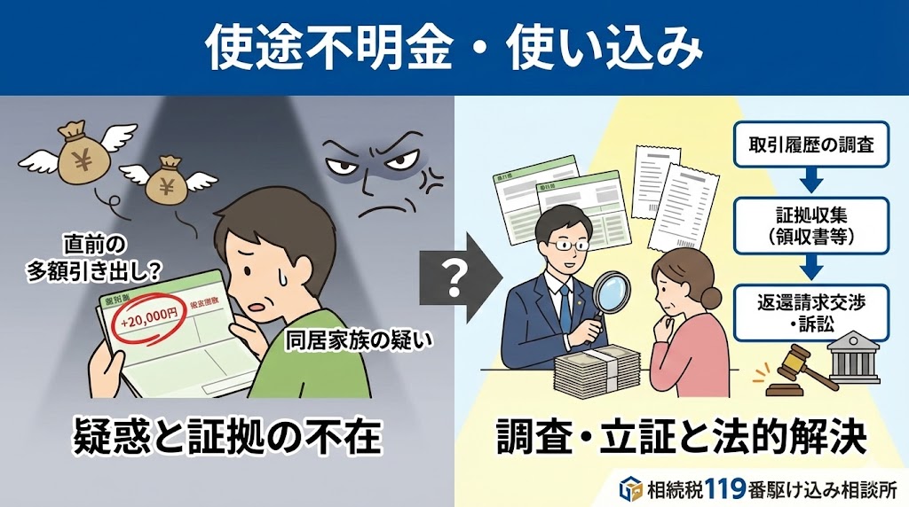 「亡くなった親の通帳を見たら、直前に多額の引き出しがあった」。同居家族や介護者による使い込み(使途不明金)は、相続トラブルの代表例です。 疑惑を持った時にまず行うべき銀行取引履歴の調査方法や、使い込みを立証するための証拠の集め方、そして法的に返還を求めるための交渉・訴訟のプロセスについて解説します。