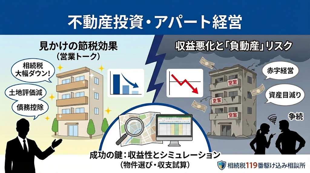 「アパートを建てれば相続税が減る」と営業されたことはありませんか? 確かに、土地の評価減や借入金の債務控除により、見かけ上の相続税は圧縮できます。 しかし、収益性が低ければ「争続」の原因や資産を目減りさせる「負動産」になりかねません。不動産投資による節税のメカニズムと、絶対に失敗しないための物件選びや収益シミュレーションの重要性を説きます。