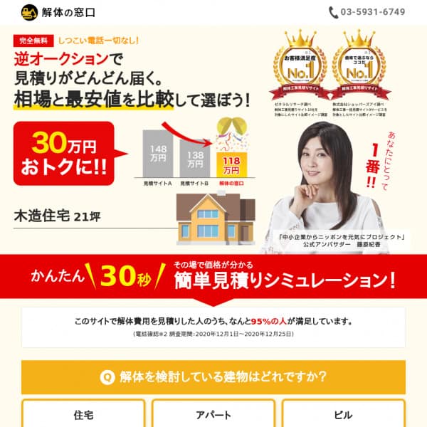 - 見積もりがオークション形式で届くので、付近の解体費用相場と最安値がわかります。
