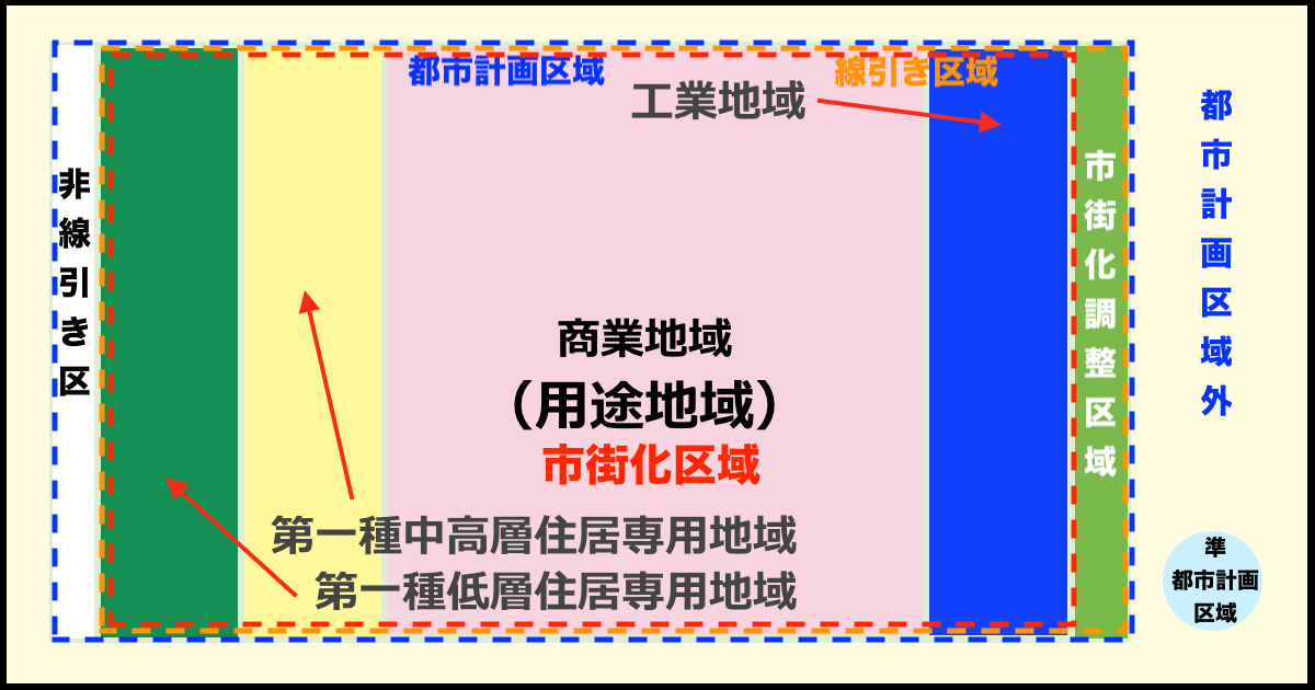 | 第1種低層 第2種低層 | 第1種中高 第2種中高 | 第1種住居 第2種住居 準住居 | 近隣商業 商業 | 準工業 | 工業 | 工業専用 | |