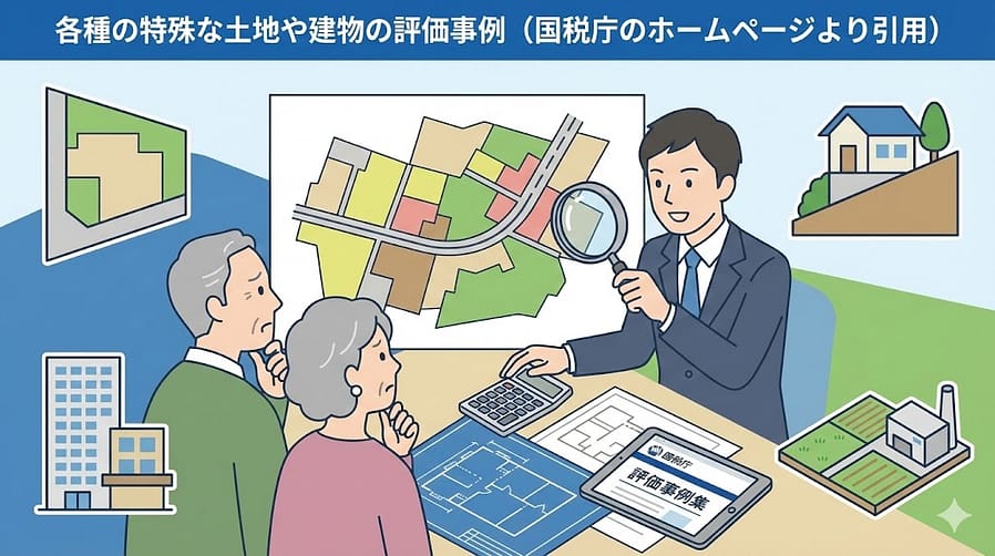 国税庁のホームページでは、各種の特殊な土地や建物を評価するための評価事例を掲載していますので、本記事にて紹介します。