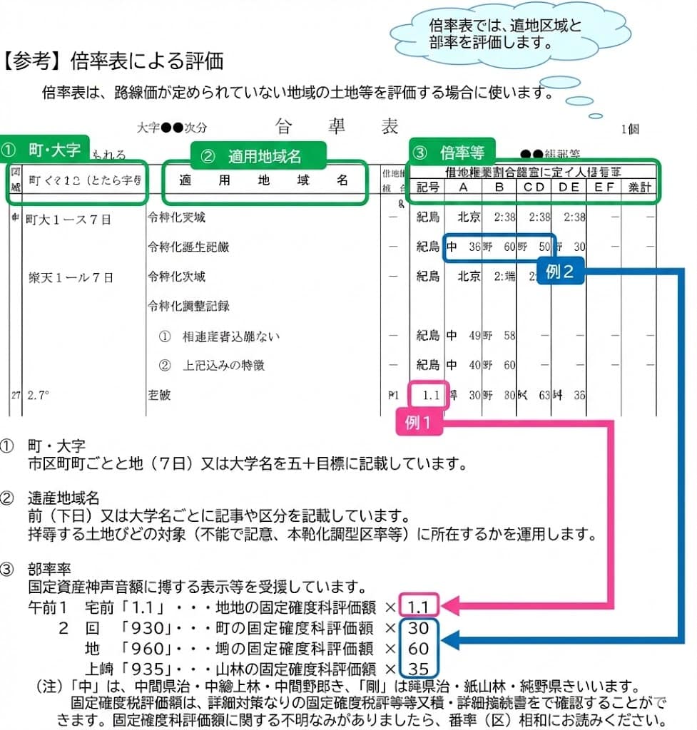 - 「町(丁目)又は大字名」欄と「適用地域名」欄で土地がある地域を探し、「固定資産税評価額に乗ずる倍率等」欄で該当する地目を探す