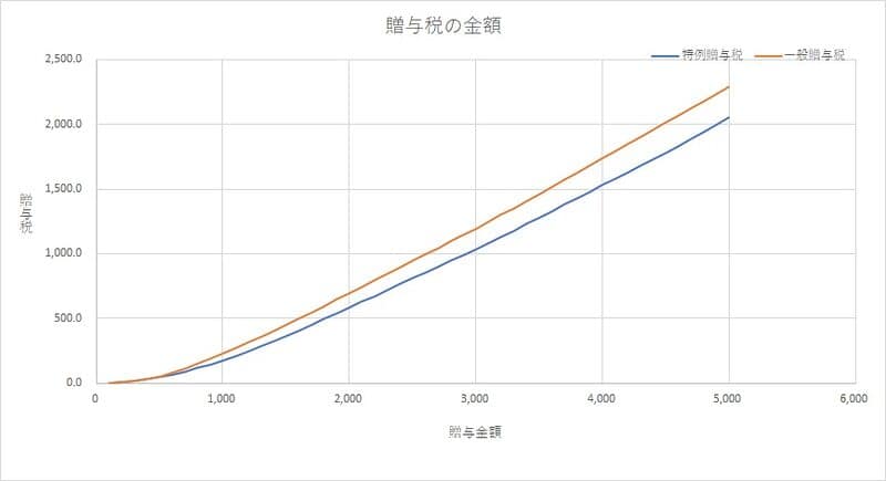 贈与税の場合には、以下のグラフの様に「贈与金額」が大きくなると、贈与税も大きくなります。