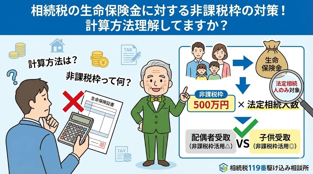 例えば、配偶者と子供2人の家族で相続が発生した時に、被相続人が契約していた生命保険の受け取りを配偶者にしていた場合には、子供2人は生命保険の非課税枠の恩恵を受けることができないということです。