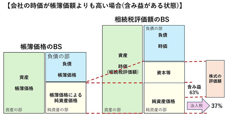 法人税=(時価による純資産価額―帳簿価額による純資産価額)×37%