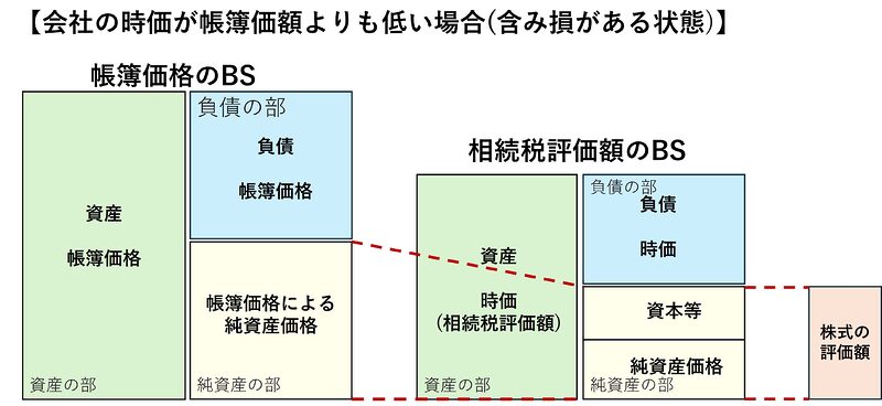 すなわち、過去の内部蓄積(剰余金等)が大きくなっているか、土地等や有価証券の含み益が大きくなっているケースですから、株価引下げの方法として含み益のある資産を除外することと、負債を増加させて純資産を減らすことになります。