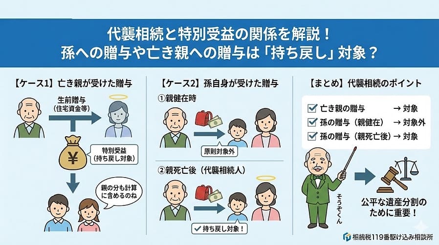 親が亡くなった時点で、孫は祖父の「代襲相続人(推定相続人)」となります。相続人の地位を得た後に受けた贈与は、他の相続人との公平を図るため、特別受益として持ち戻しの計算対象となります。