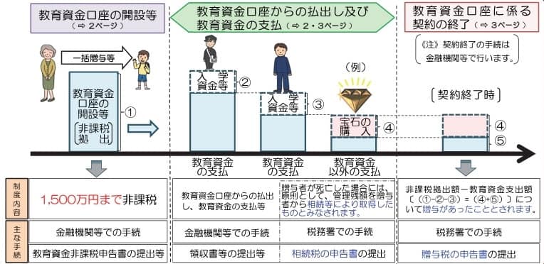 また、金融機関等から金銭等の払出し及び教育資金の支払を行った場合には、教育資金の支払に充てた領収書などを一定の期限までに金融機関等へ提出する必要があります。