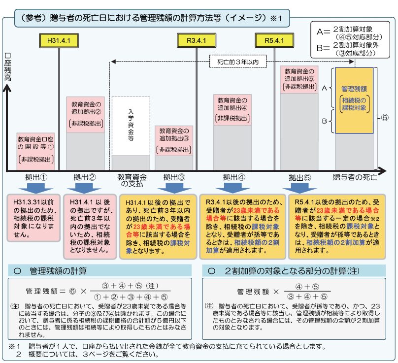 契約期間中に贈与者が死亡した場合には、贈与された教育資金のうち一定の管理残額は、原則として相続財産となり相続税の課税対象になります。
